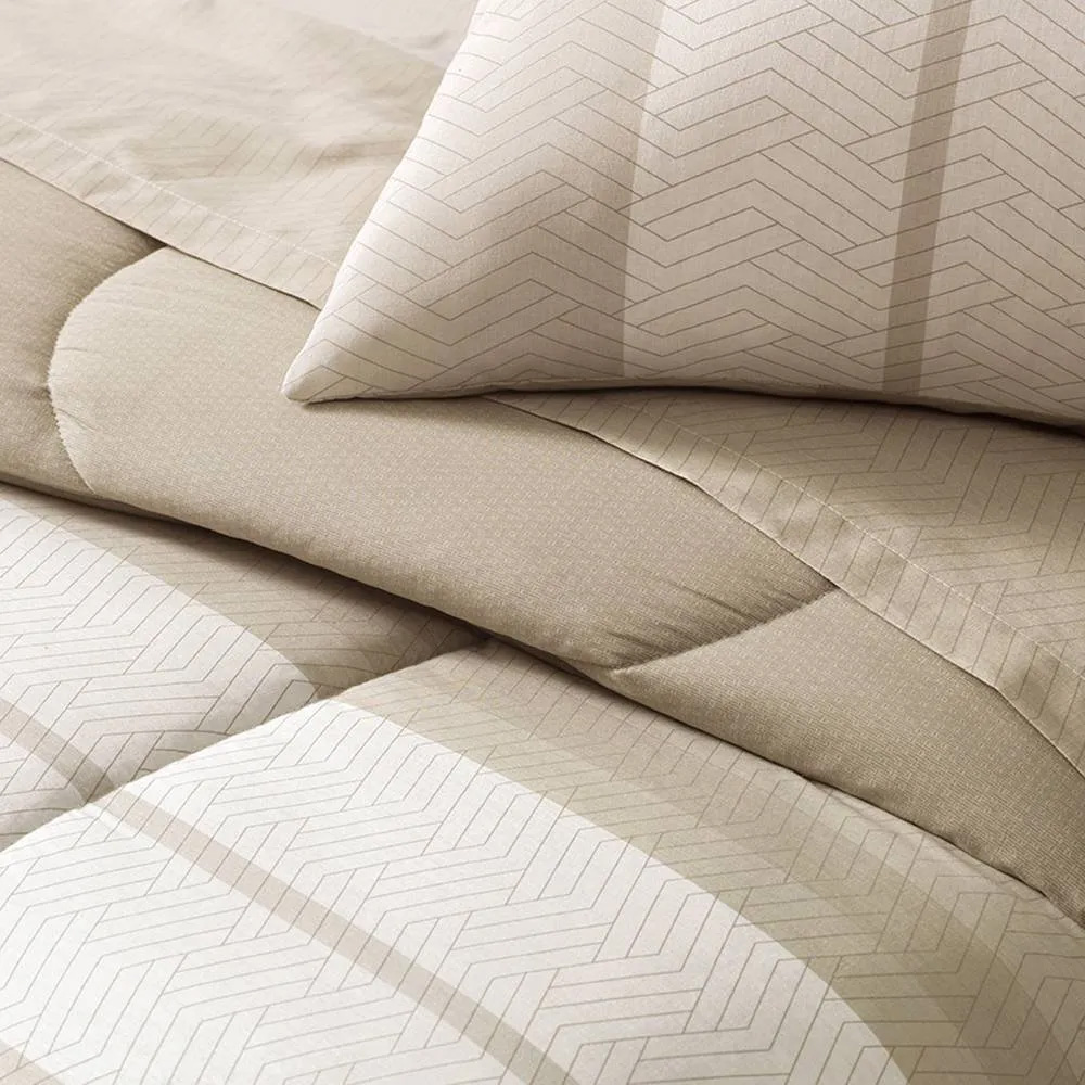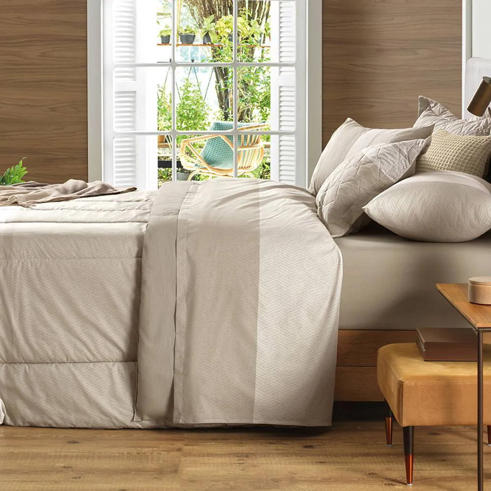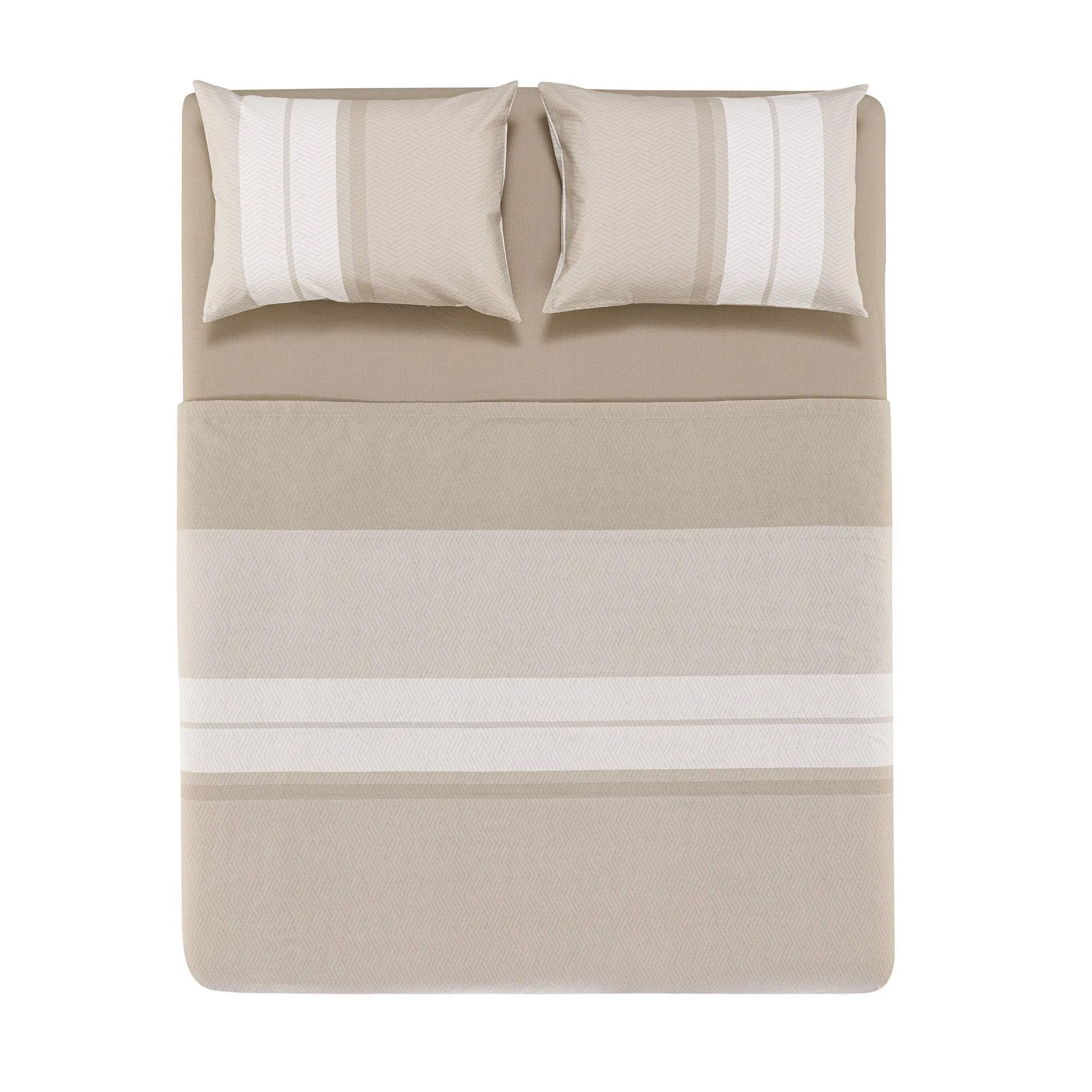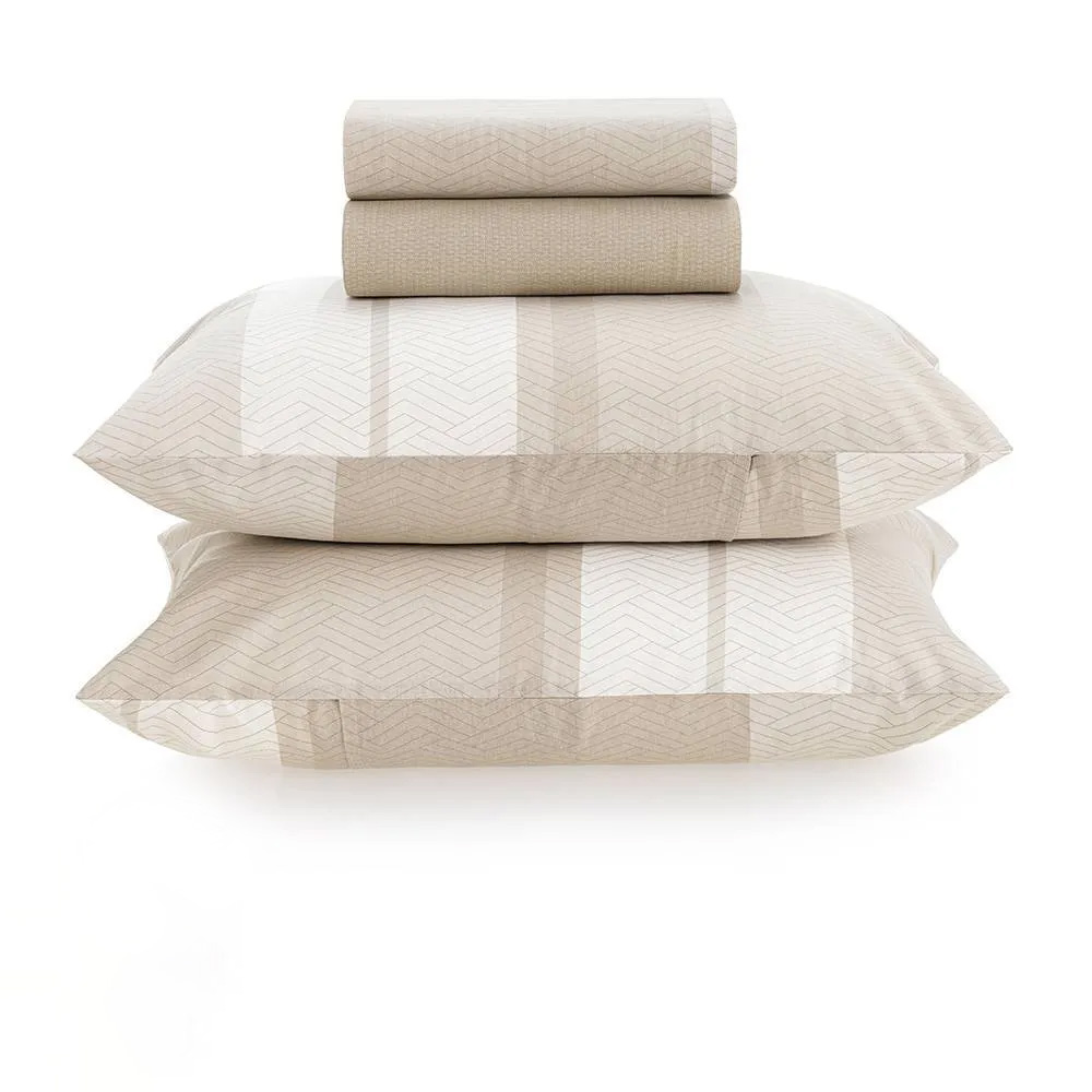 O lençol de elástico é em um bege elegante com estampa minimalista e discreta, sendo ideal para colchões de até 30 cm. Já o sobre lençol ilustra a mesma estampa das fronhas, com cores neutras combinadas com linhas finas que formam um desenho geométrico cheio de estilo. O Jogo de Cama Casal Karsten Levi é atemporal e fácil de combinar.