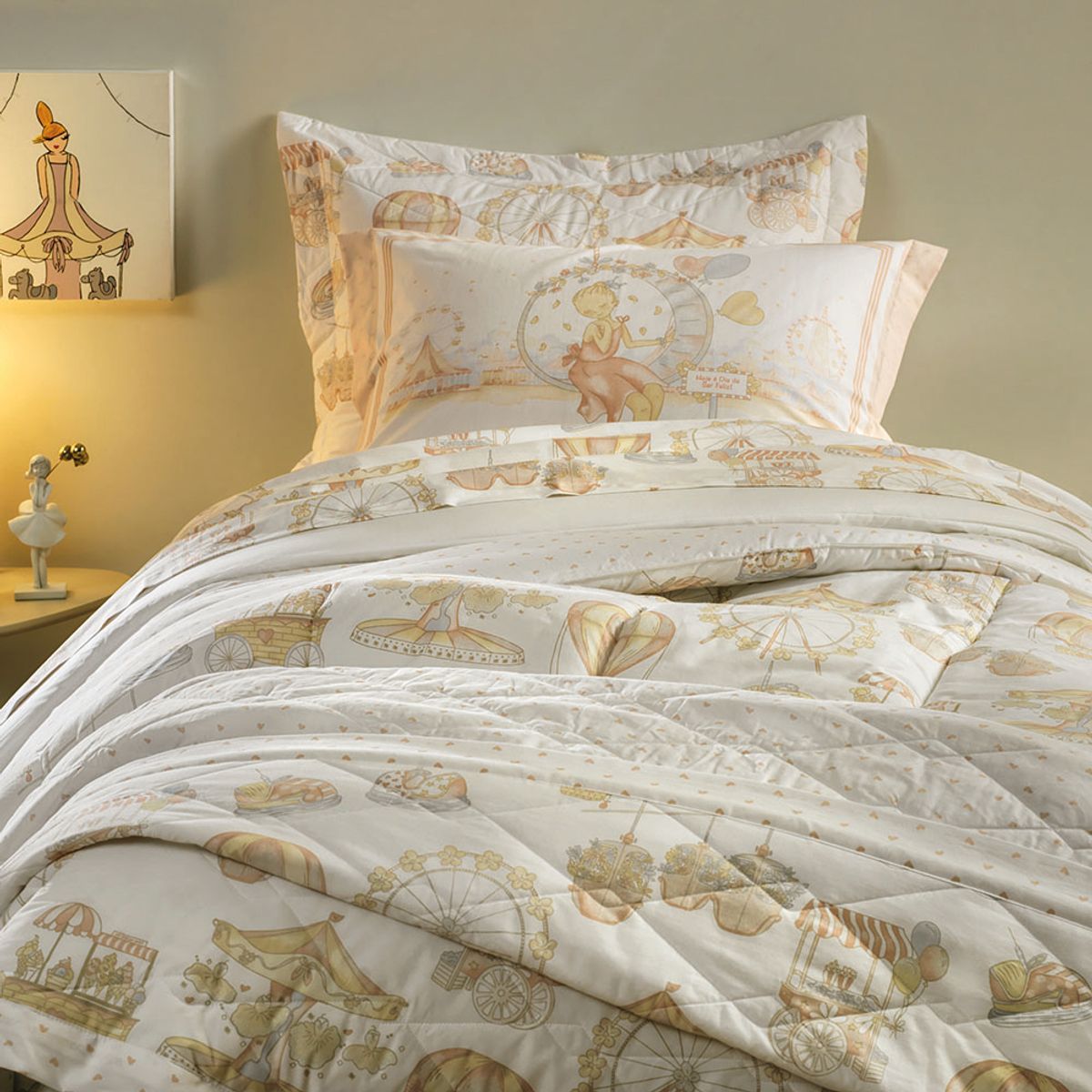 Transforme o quarto das crianças com o encantador Jogo de Cama Infantil Vick tamanho Solteiro. Confeccionado em 100% algodão, o jogo é altamente respirável e hipoalergênico, proporcionando noites tranquilas e confortáveis. O sobre lençol de 1,80m x 2,50m conta com dobra feita e uma estampa divertida repleta de brinquedos, enquanto o lençol com elástico de 1,00m x 2,00m x 35cm oferece ajuste perfeito ao colchão. As fronhas com medidas 50cm x 70cm possuem 4 abas de 4 cm, garantindo acabamento impecável e delicado. O tecido encorpado e antipilling assegura resistência e maciez ao toque. Complemente o enxoval infantil com qualidade junto do edredom e jogo de colcha da mesma linha.