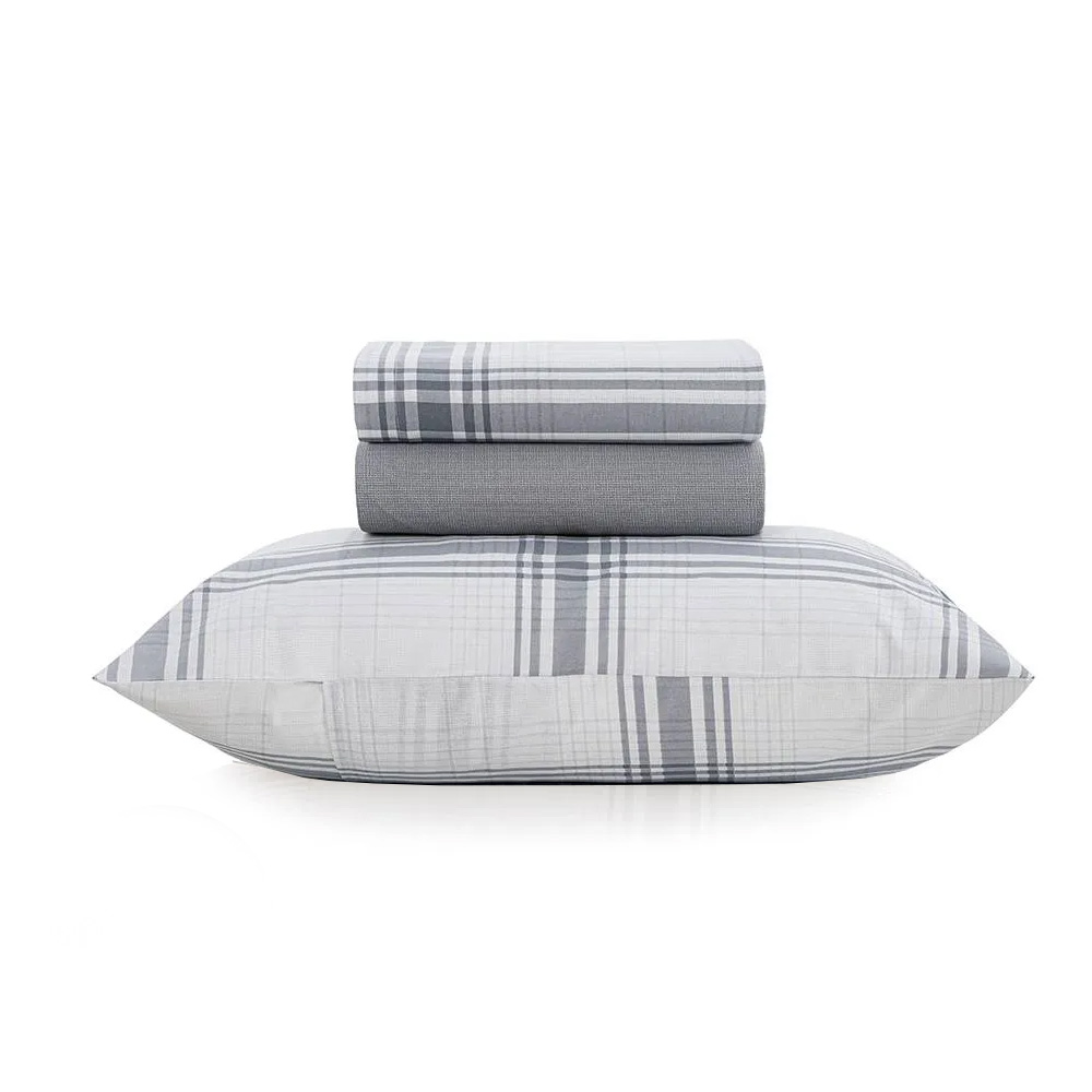 O lençol de elástico tem padronagem minimalista em tom de cinza, sendo ideal para colchões de até 30 cm. Já o sobre lençol ilustra a mesma estampa das fronhas, com sobreposições de tons de cinza em xadrez que formam um desenho clássico e estiloso, o Jogo de Cama Solteiro Karsten Dom é atemporal e fácil de combinar.